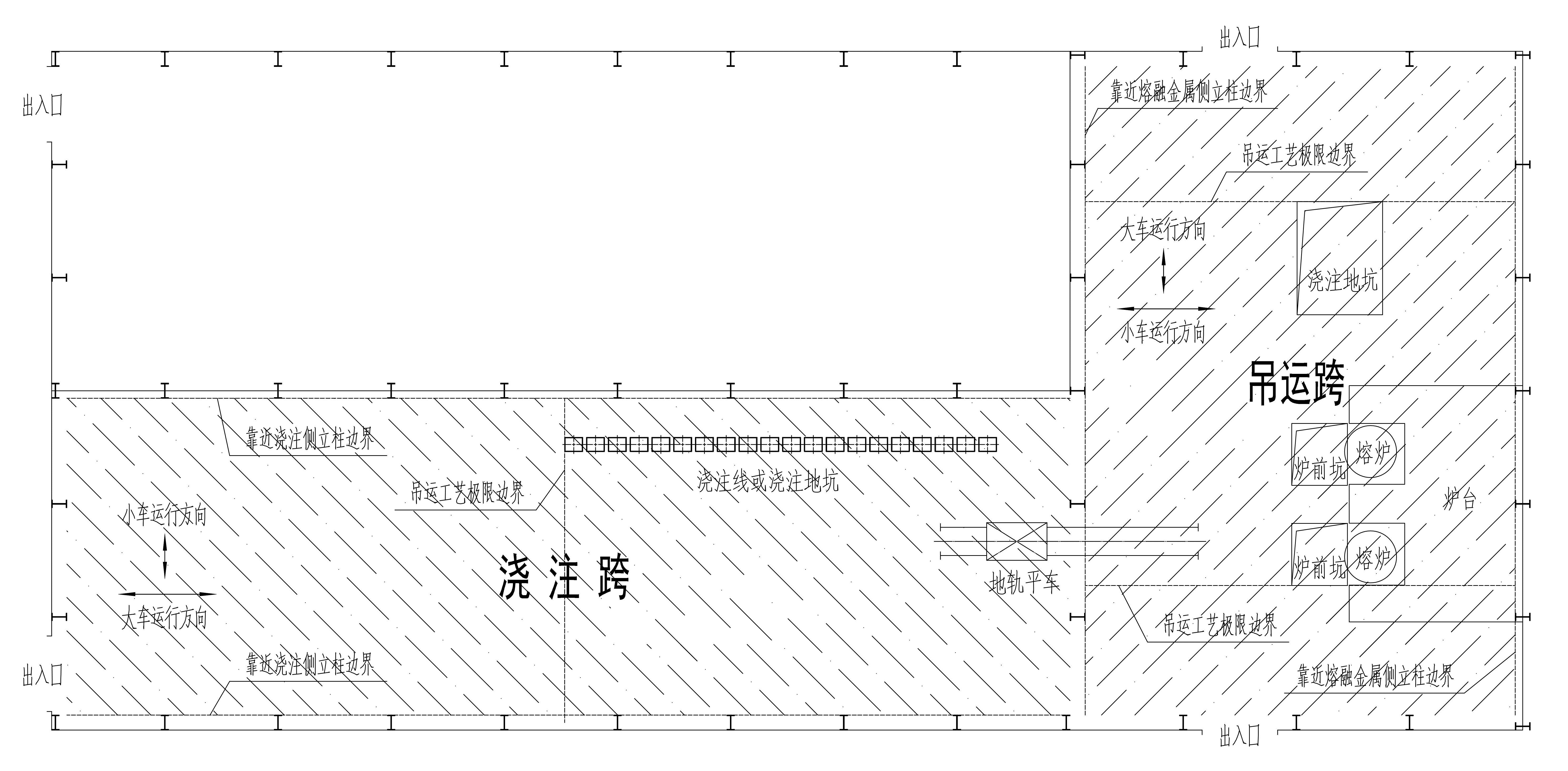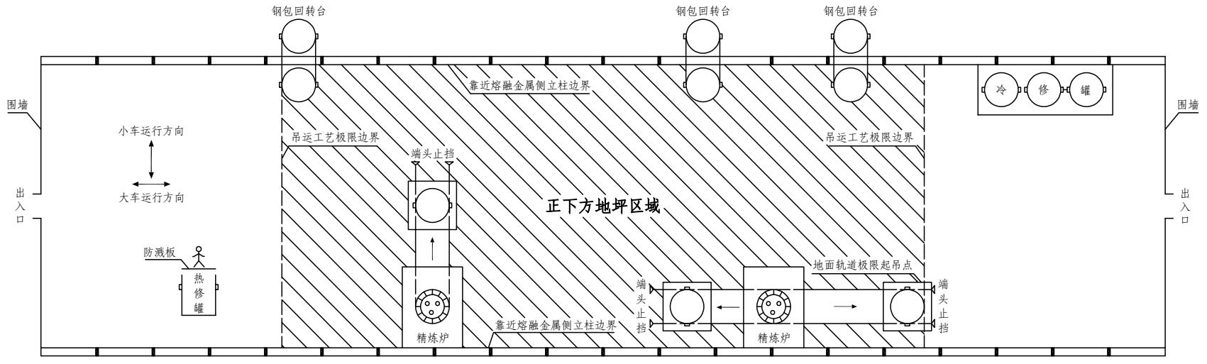 注:“正下方地坪区域”是指横向以吊运跨两侧立柱靠近熔融金属吊运侧的立柱边线为界,纵向以吊运跨最两端的铁水、钢水、液渣吊运工艺极限边界为界的车间地坪区域(图4-2)。