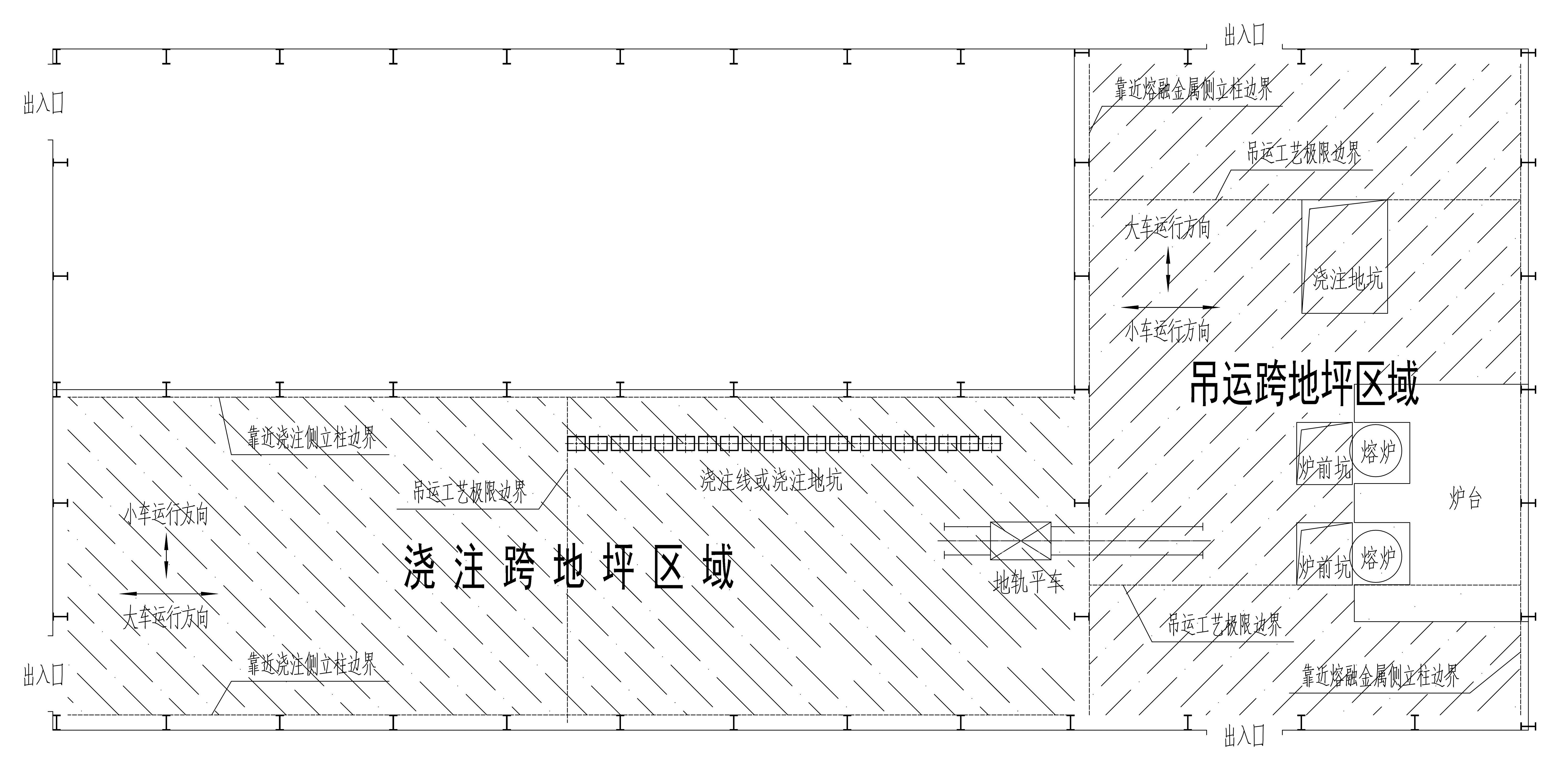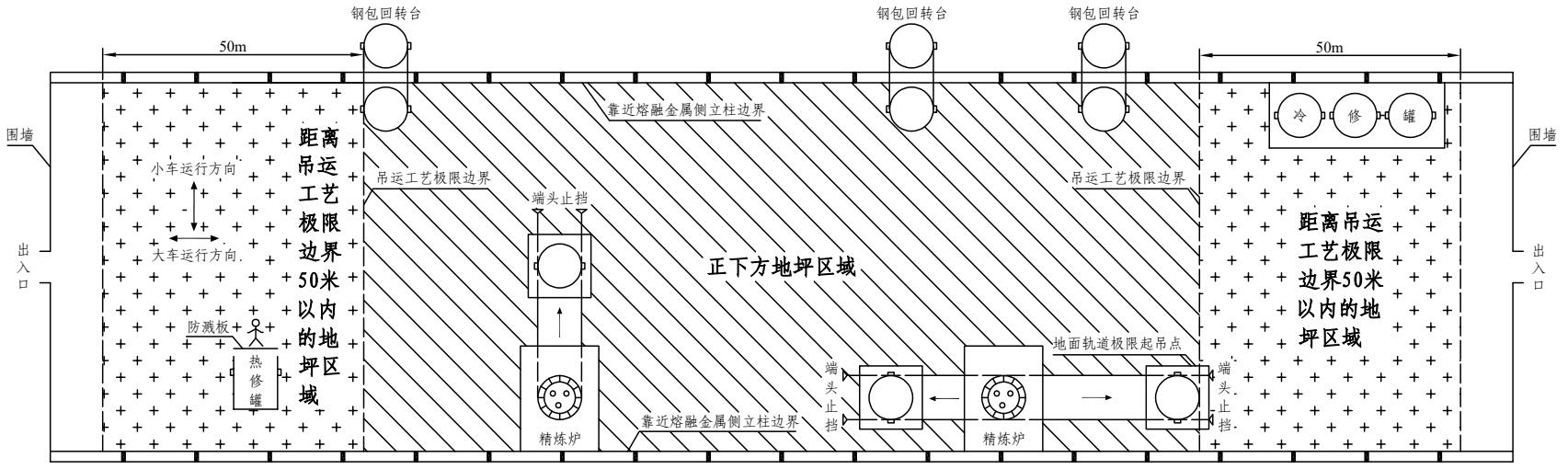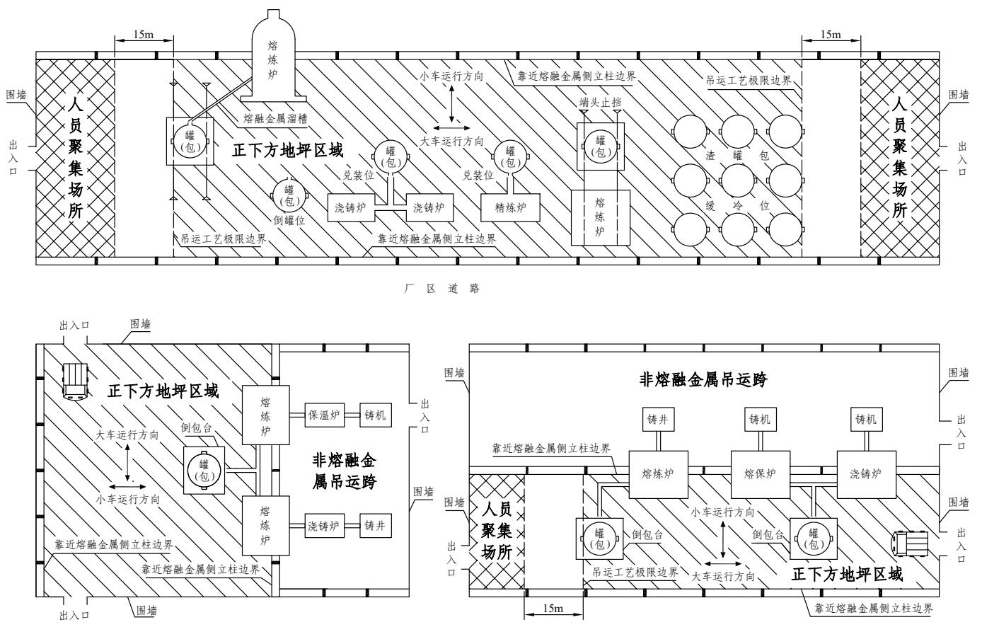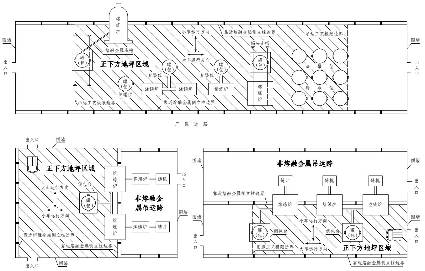 注:“正下方地坪区域”是指横向以吊运跨两侧立柱靠近熔融金属吊运侧的立柱边线为界,纵向以吊运跨最两端的铁水、钢水、液渣吊运工艺极限边界为界的车间地坪区域(图4-2)。