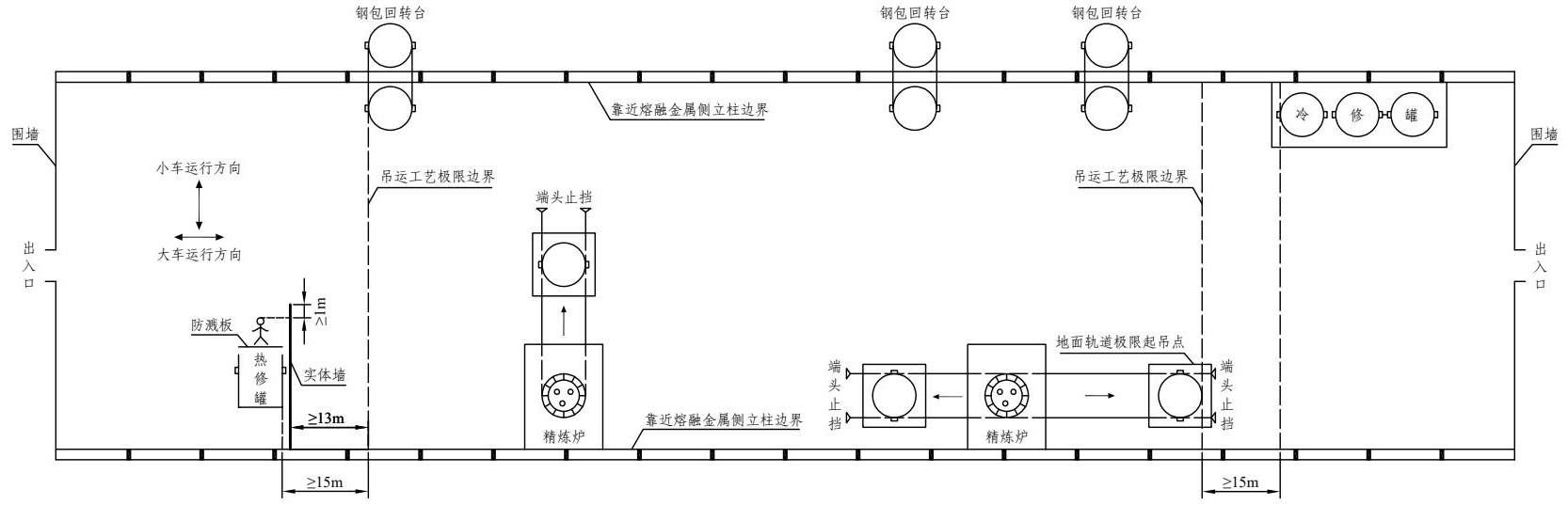 注:“安全防护要求”是指钢水罐冷(热)修工位、铁水罐冷修工位的罐体外壁(靠近罐体吊运工艺极限边界一侧),与熔融金属吊运工艺极限边界间距大于等于15米;钢水罐热修工位靠近熔融金属吊运侧还需设置高度大于等于2米,宽度超出热修操作工位1米以上的实体墙(图4-4);实体墙与吊运工艺极限边界的距离应大于等于13米。